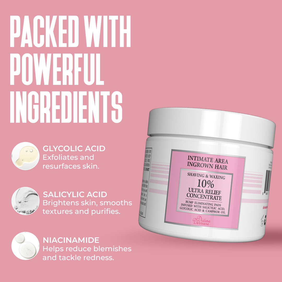 Blast your bumps away with the Divine Derriere bikini bump eliminator pads! Easy-to-use pre-moistened pads help exfoliate and smooth your skin. Gently exfoliate to target ingrown hairs for smoother bump-free skin. Exfoliates the top layer of the skin and penetrates deep into the cell, freeing skin-trapped hairs and preventing new ingrown hairs from forming.