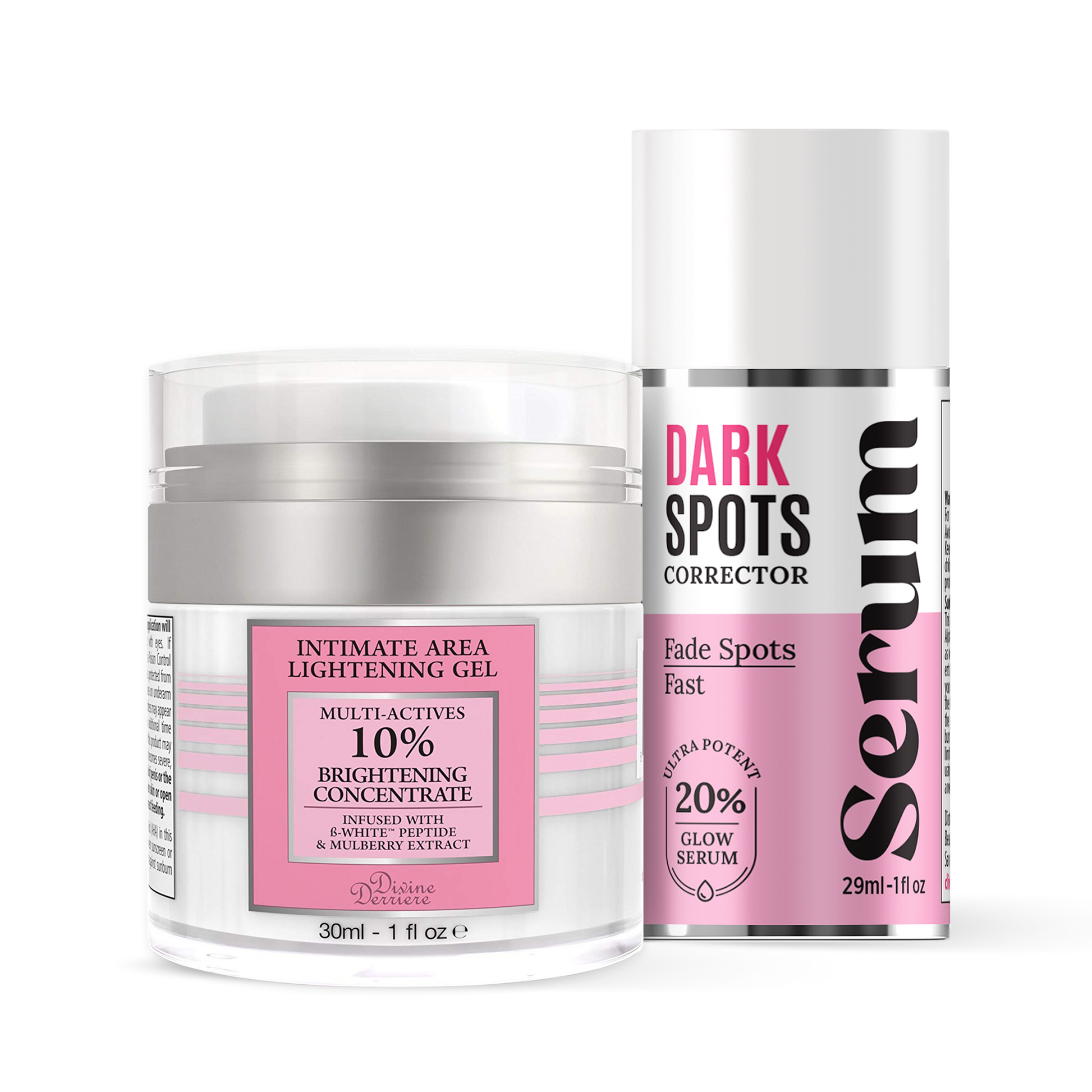 Our bestselling, TikTok-hot Intimate Gel and Ultra Potent Dark Spots Serum will help enhance the overall tone of your most private areas. Specifically designed to help address the look of discolored areas to blend and enhance the overall skin's appearance in even sensitive skin. Correct excess spots caused by tanning, hormones or hair removal.