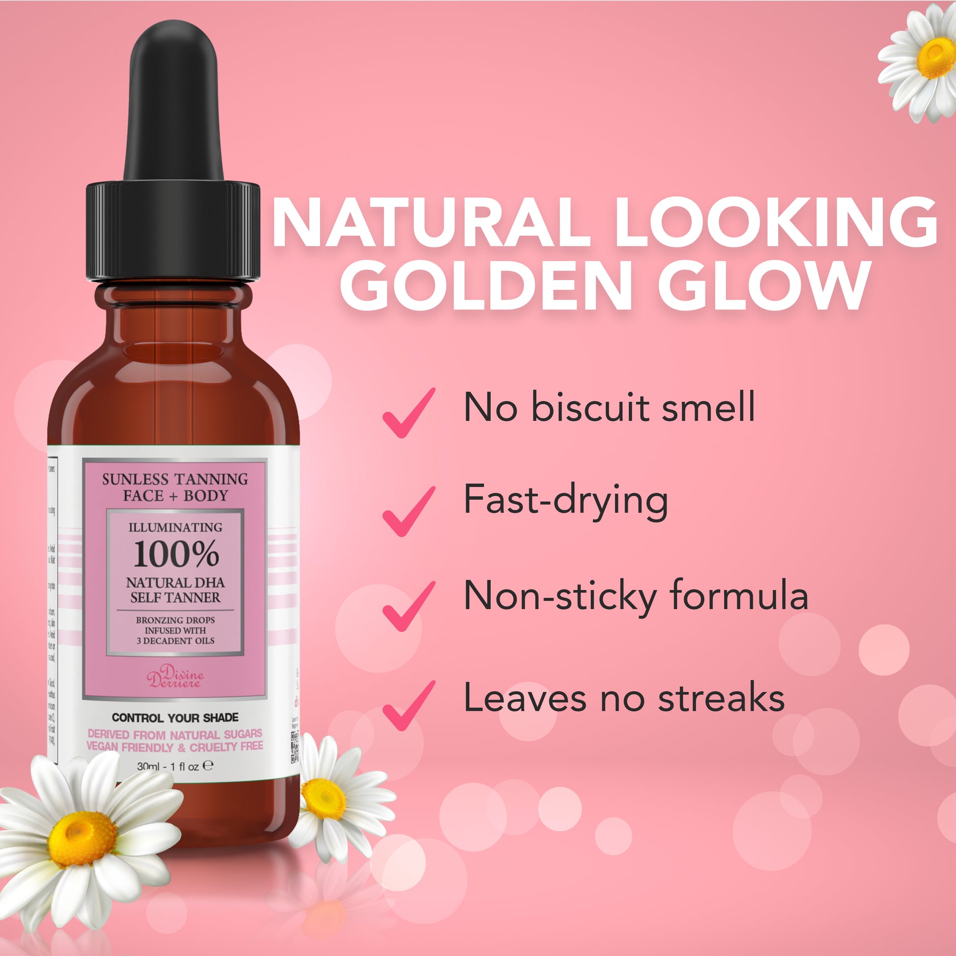 Get Your Most Natural Tan Ever Without Setting Foot In A Tanning Bed, Salon Or The Sun. No Chemical Smell & Easy Application! Our self-tanner drops transforms any moisturizer, serum, or face oil into a custom self tanner. Create a customized tan by mixing the tan drops with your favorite moisturizer. More drops = more glow.